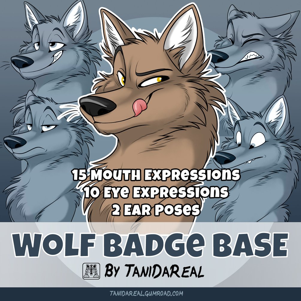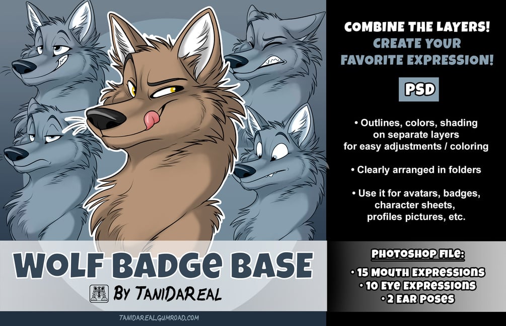 This is a wolf / dog / canine badge base (Photoshop file) – combine the different eye and mouth layers to create your favorite expression – you can create up to 300 different versions with it! You can use it as a badge, avatar, profile picture or reference sheet!